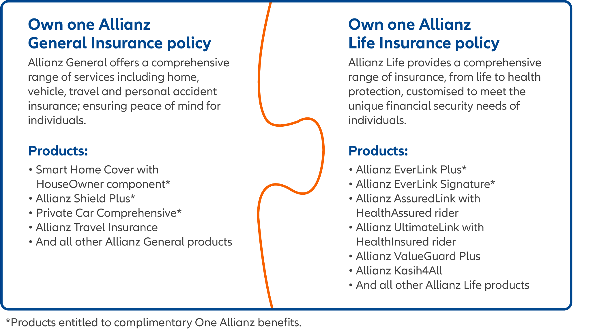 Say goodbye to complexity and hello to convenience, all while ensuring comprehensive protection for your every need. Plus, you'll be rewarded with complimentary One Allianz benefits as a One Allianz customer!